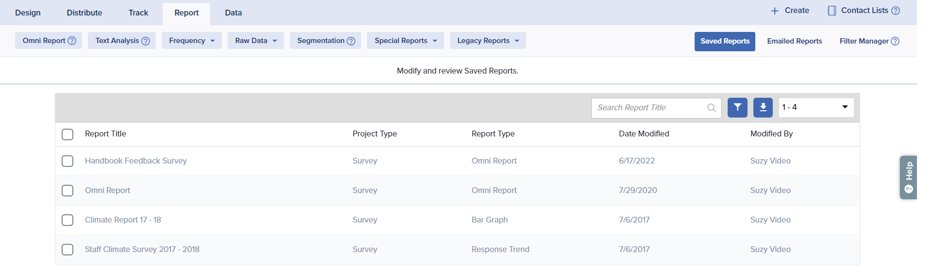 Based on your display resolution or browser zoom, you may see a 3-dot icon on the far right of the Report menu bar. Click here to access Saved Reports, Emailed Reports, and Filter Manager.