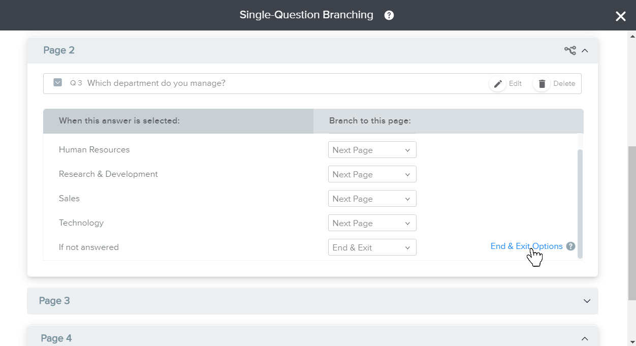 - Next to the answer option that should prompt a participant to exit from the survey, choose End & Exit from the dropdown.
