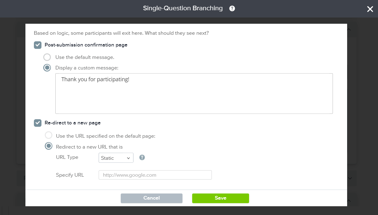 While setting up logic, use End and Exit to finish the project on a particular page based on participants’ answers. This option is very useful if later questions in a project are irrelevant to some groups, or if you need to qualify participants early in the process and excuse those whose responses are not relevant or required.