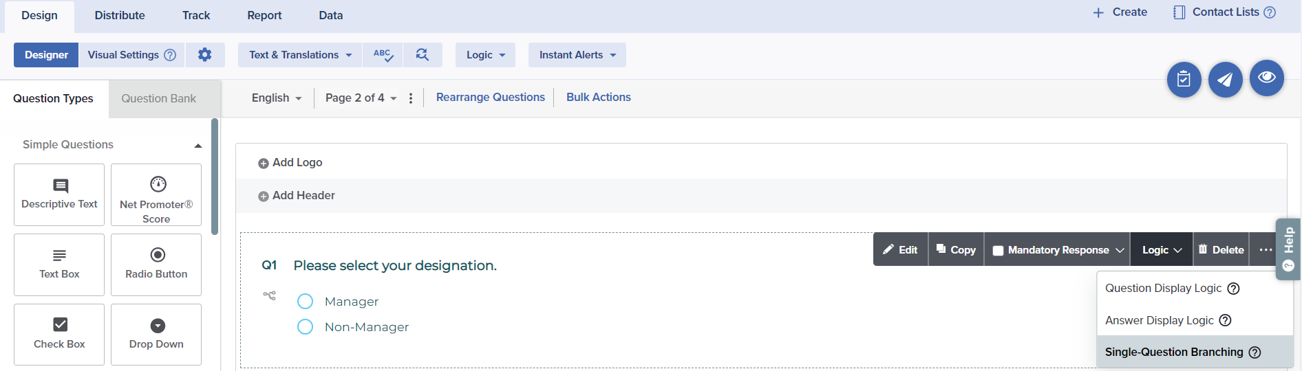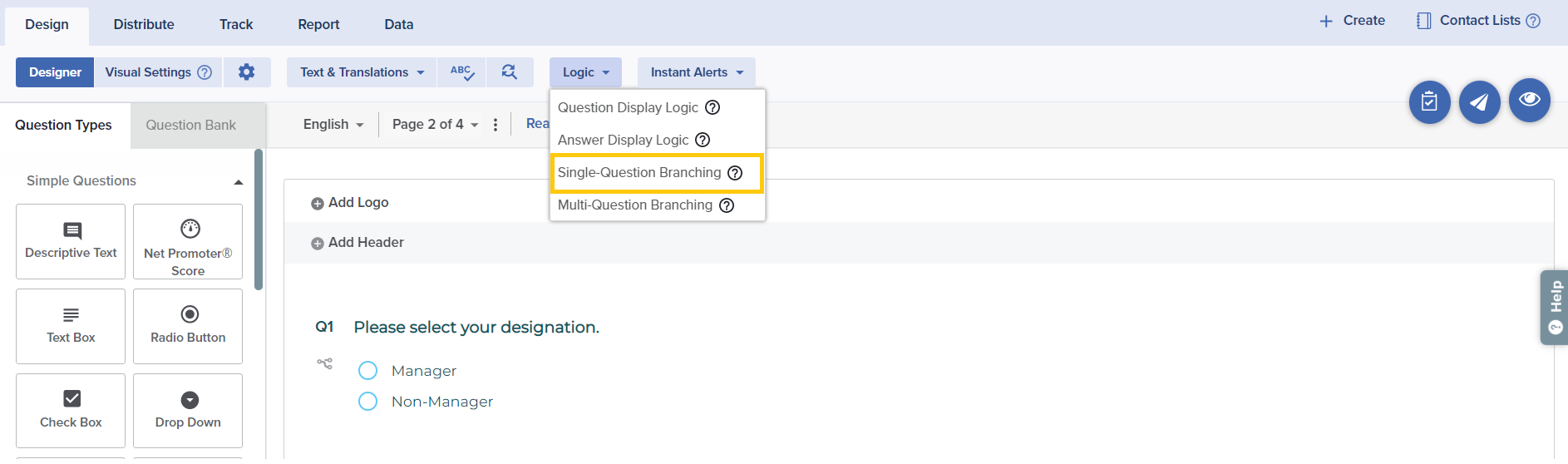 Alternately, you can also set Single-Question Branching by clicking on Logic in the Design menu bar.