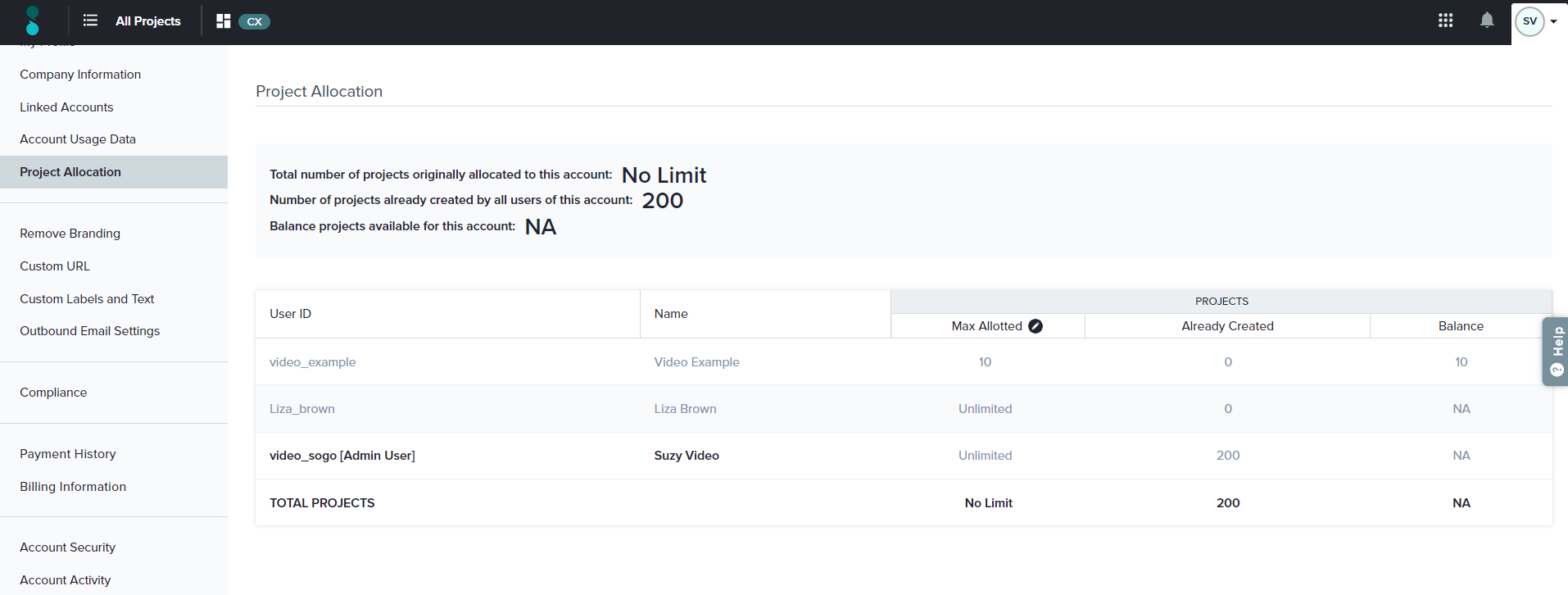 This section gives you a brief look at the number of projects created in your account, along with the statistics of any projects created by each user. Here, you can review the number of projects created by each user and set the maximum total number of projects a sub-user can create.