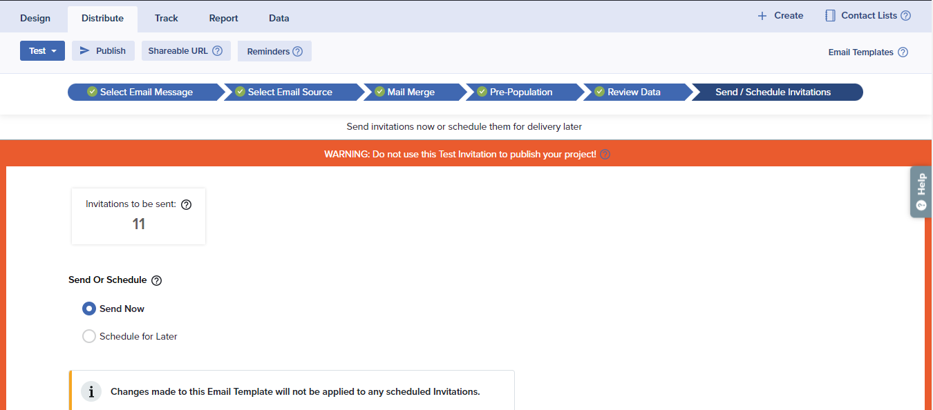 You may also send Test Invitations before launching actual invitations, to preview and test all aspects of both your invitation and project.You may send Test Invitations from either Design or Distribute.