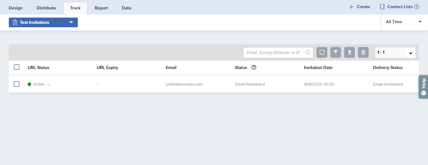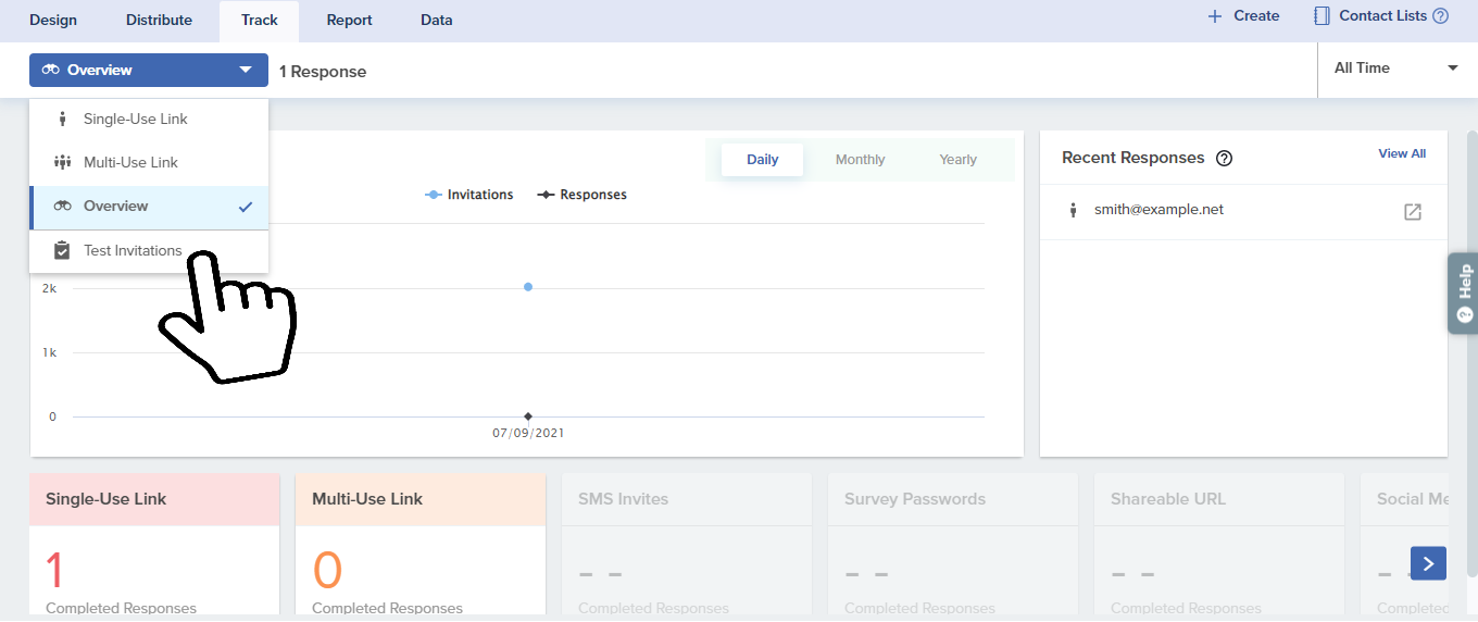 Test Invitations sent are not displayed alongside “real” invitations in Track or elsewhere in the platform, nor calculated in response rate or other reports. Still, you can track what’s happening with any Test Invitations by looking in the right place! Plus, you can review any responses submitted for reference during your testing.