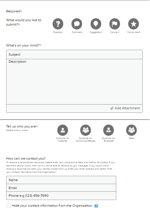 • Response Type: Customers may select only one category – Question, Comment, Suggestion, Concern, or Compliment. Mandatory.